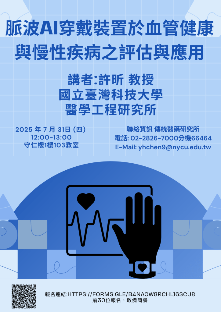 7 月 28 2025 114年7月31日(四) 特別演講-許昕教授:脈波AI穿戴裝置於血管健康與慢性疾病之評估與應用 活動集錦 114年7月31日(四) 特別演講-許昕教授:脈波AI穿戴裝置於血管健康與慢性疾病之評估與應用 閱讀全文 »