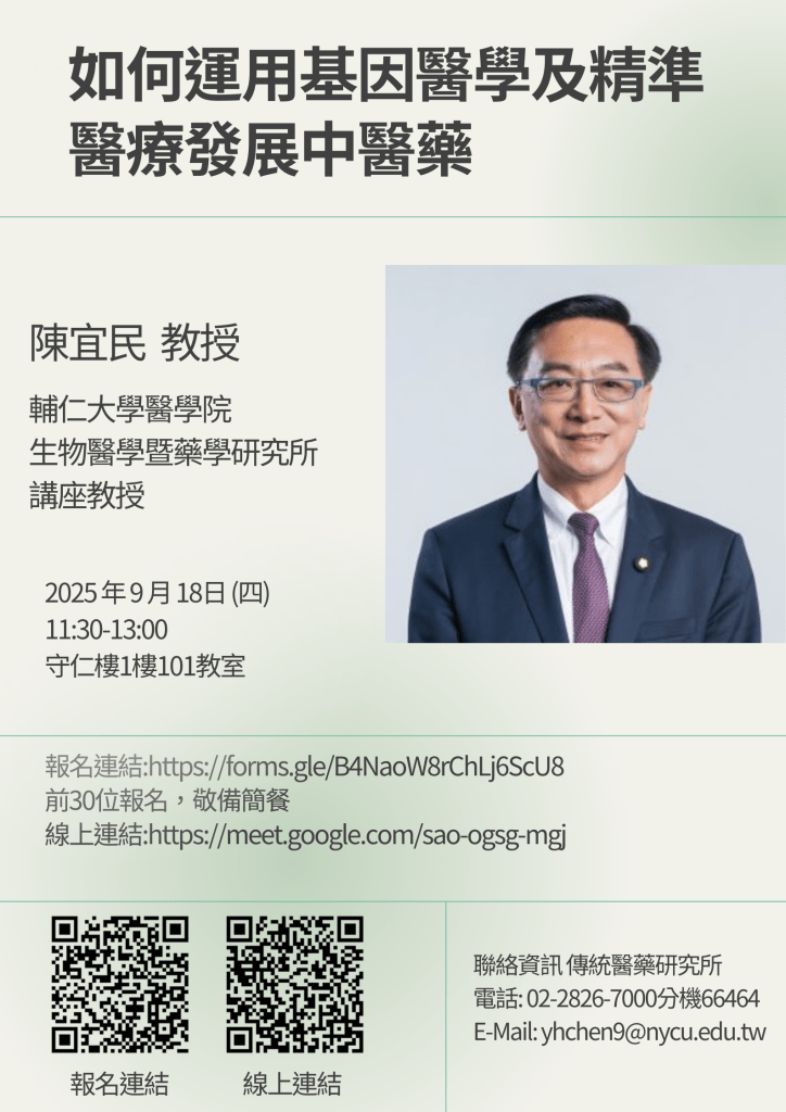 4 月 8 2025 114年5月1日(四) 校友演講-沈郁強研究員:從防疫到轉譯醫學:臺灣清冠中藥在非病毒性疾病與多重器官衰竭中的臨床創新應用 活動集錦 114年5月1日(四) 校友演講-沈郁強研究員:從防疫到轉譯醫學:臺灣清冠中藥在非病毒性疾病與多重器官衰竭中的臨床創新應用 閱讀全文 »