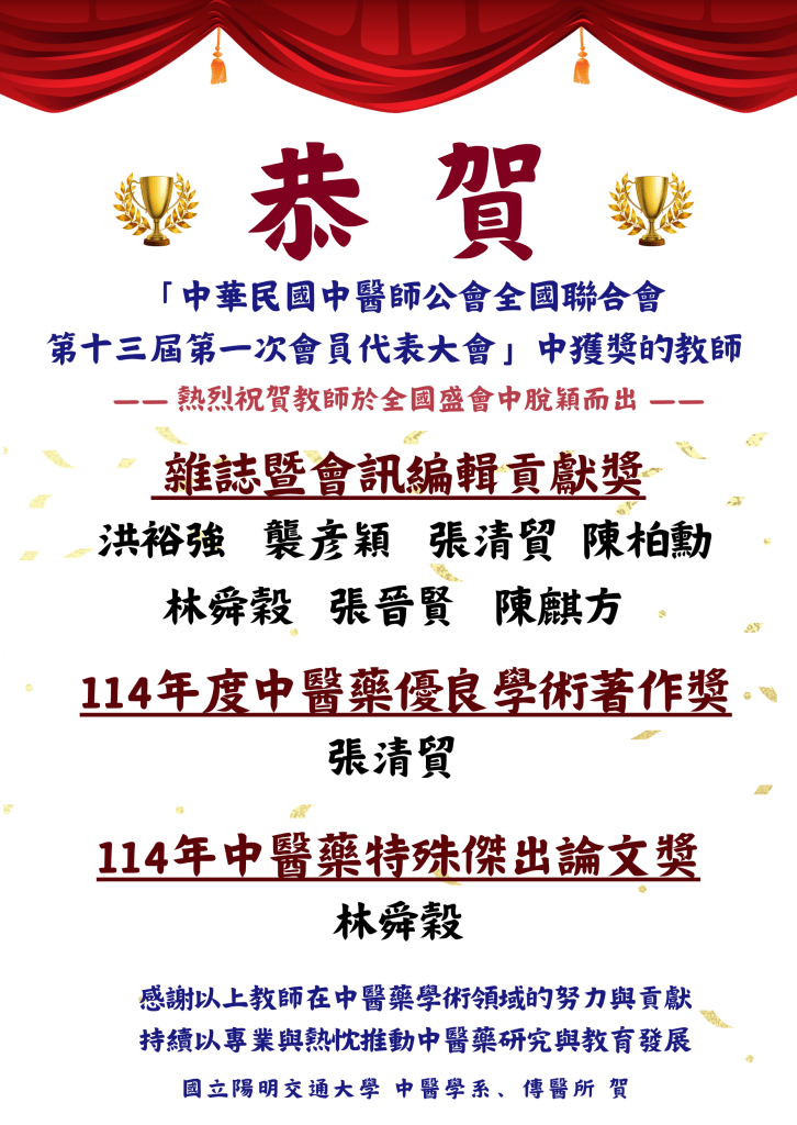 10 月 28 2025 狂賀!本所教師榮獲「中華民國中醫師公會全國聯合會 第十三屆第一次會員代表大會」多項大獎! 榮譽 狂賀!本所教師榮獲「中華民國中醫師公會全國聯合會 第十三屆第一次會員代表大會」多項大獎! 閱讀全文 »