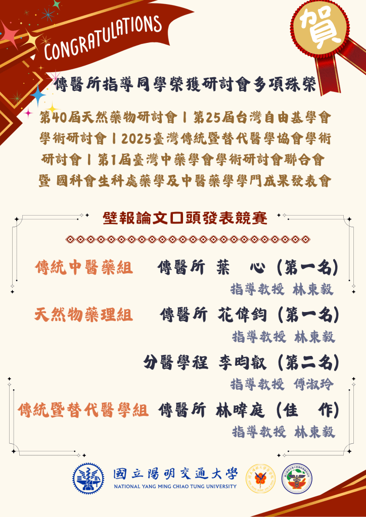 10 月 27 2025 狂賀!本所指導同學榮獲研討會(第40屆天然藥物研討會/第25屆台灣自由基學會學術研討會/2025台灣傳統暨替代醫學協會學術研討會/第1屆台灣中藥學會學術研討會聯合會暨國科會生科處藥學及中醫藥學學門成果發表會)多項殊榮 榮譽 狂賀!本所指導同學榮獲研討會(第40屆天然藥物研討會/第25屆台灣自由基學會學術研討會/2025台灣傳統暨替代醫學協會學術研討會/第1屆台灣中藥學會學術研討會聯合會暨國科會生科處藥學及中醫藥學學門成果發表會)多項殊榮 閱讀全文 »