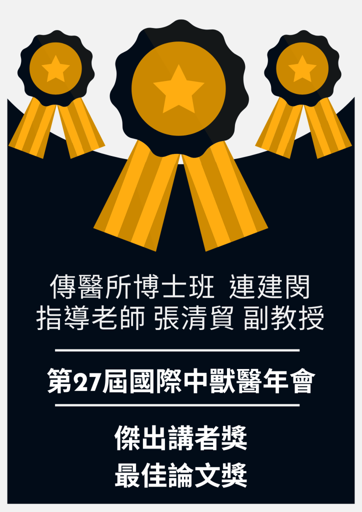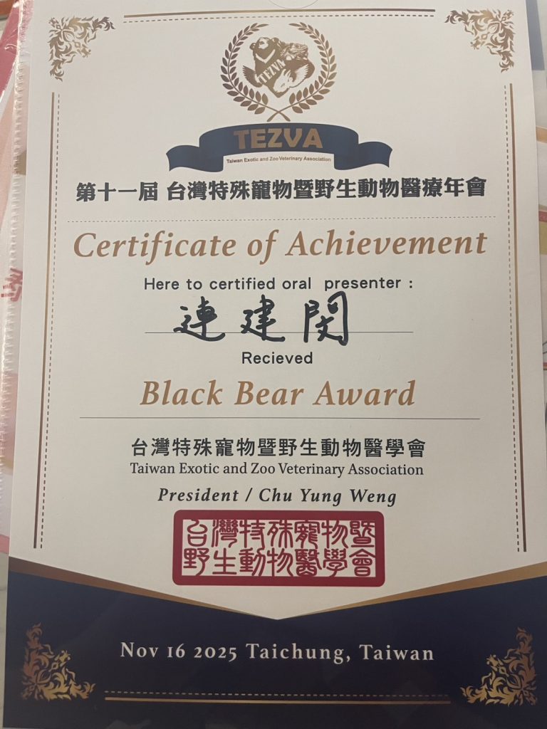 11 月 20 2025 狂賀!本所 連建閔 同學榮獲「第十一屆 台灣特殊寵物暨野生動物醫療年會(TEC11)」臨床案例報告評審評選第一名黑熊獎 榮譽 […] 狂賀!本所 連建閔 同學榮獲「第十一屆 台灣特殊寵物暨野生動物醫療年會(TEC11)」臨床案例報告評審評選第一名黑熊獎 閱讀全文 »